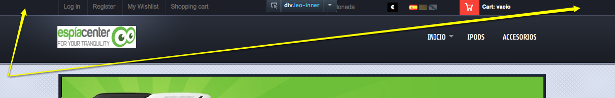 Snapy Posted June 11, 2013 Share Posted June 11, 2013 Hola a tod@s, He implementado la plantilla hitech: http://www.leotheme.com/demo/prestashop14x/?template=leo_hitech en mi tienda: http://espiacenter.com/prestashop/index.php# y resulta que justo arriba del todo hay una barra de color #1c1f27 que tengo que cambiar sí o sí, el problema es que no sé donde "tocar" para cambir ese color, justo en el centro de esta barra está la sección de carrito, moneda, idioma, etc. esto ya lo tengo controlado y lo puedo cambiar de color (que será el mismo del total de barra, el caso es que cuando se cambie, se verán también los laterales cambiados ( que es lo que no sé hacer). sé en que div está pero no como llegar (que dramático... ;-)) y cambiarlo. acompaño dos imágenes donde se aprecia la parte de código y lo que quiero cambiar. un saludo y graciaa tod@s. Link to comment Share on other sites More sharing options...