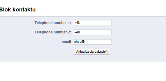 gibon93 Posted June 12, 2013 Author Share Posted June 12, 2013 (edited) to dobrze jak by ktoś potrzebował modules/blockcontact/blockcontact.php <?php /* * 2007-2013 PrestaShop * * NOTICE OF LICENSE * * This source file is subject to the Academic Free License (AFL 3.0) * that is bundled with this package in the file LICENSE.txt. * It is also available through the world-wide-web at this URL: * http://opensource.org/licenses/afl-3.0.php * If you did not receive a copy of the license and are unable to * obtain it through the world-wide-web, please send an email * to [email protected] so we can send you a copy immediately. * * DISCLAIMER * * Do not edit or add to this file if you wish to upgrade PrestaShop to newer * versions in the future. If you wish to customize PrestaShop for your * needs please refer to http://www.prestashop.com for more information. * * @author PrestaShop SA <[email protected]> * @copyright 2007-2013 PrestaShop SA * @license http://opensource.org/licenses/afl-3.0.php Academic Free License (AFL 3.0) * International Registered Trademark & Property of PrestaShop SA */ if (!defined('_CAN_LOAD_FILES_')) exit; class Blockcontact extends Module { public function __construct() { $this->name = 'blockcontact'; $this->tab = 'front_office_features'; $this->version = '1.0'; parent::__construct(); $this->displayName = $this->l('Contact Block'); $this->description = $this->l('Allows you to add additional information about your store\'s customer service.'); } public function install() { return parent::install() && Configuration::updateValue('blockcontact_telnumber', '') && Configuration::updateValue('blockcontact_telnumber2', '') && Configuration::updateValue('blockcontact_email', '') && $this->registerHook('displayRightColumn') && $this->registerHook('displayHeader'); } public function uninstall() { // Delete configuration return Configuration::deleteByName('blockcontact_telnumber') && Configuration::deleteByName('blockcontact_telnumber2') && Configuration::deleteByName('blockcontact_email') && parent::uninstall(); } public function getContent() { $html = ''; // If we try to update the settings if (Tools::isSubmit('submitModule')) { Configuration::updateValue('blockcontact_telnumber', Tools::getValue('telnumber')); Configuration::updateValue('blockcontact_telnumber2', Tools::getValue('telnumber2')); Configuration::updateValue('blockcontact_email', Tools::getValue('email')); $this->_clearCache('blockcontact.tpl'); $html .= '<div class="conf confirm">'.$this->l('Configuration updated').'</div>'; } $html .= ' <h2>'.$this->displayName.'</h2> <form action="'.Tools::htmlentitiesutf8($_SERVER['REQUEST_URI']).'" method="post"> <fieldset> <label for="telnumber">'.$this->l('Telephone number 1:').'</label> <input type="text" id="telnumber" name="telnumber" value="'.((Configuration::get('blockcontact_telnumber') != '') ? Tools::safeOutput(Configuration::get('blockcontact_telnumber')) : '').'" /> <div class="clear"> </div> <label for="telnumber2">'.$this->l('Telephone number 2:').'</label> <input type="text" id="telnumber2" name="telnumber2" value="'.((Configuration::get('blockcontact_telnumber2') != '') ? Tools::safeOutput(Configuration::get('blockcontact_telnumber2')) : '').'" /> <div class="clear"> </div> <label for="email">'.$this->l('Email').'</label> <input type="text" id="email" name="email" value="'.((Configuration::get('blockcontact_email') != '') ? Tools::safeOutput(Configuration::get('blockcontact_email')) : '').'" /> <div class="clear"> </div> <div class="margin-form"> <input type="submit" name="submitModule" value="'.$this->l('Update settings').'" class="button" /></center> </div> </fieldset> </form>'; return $html; } public function hookDisplayHeader() { $this->context->controller->addCSS(($this->_path).'blockcontact.css', 'all'); } public function hookDisplayRightColumn() { global $smarty; if (!$this->isCached('blockcontact.tpl', $this->getCacheId())) $smarty->assign(array( 'telnumber' => Configuration::get('blockcontact_telnumber'), 'telnumber2' => Configuration::get('blockcontact_telnumber2'), 'email' => Configuration::get('blockcontact_email') )); return $this->display(__FILE__, 'blockcontact.tpl', $this->getCacheId()); } public function hookDisplayLeftColumn() { return $this->hookDisplayRightColumn(); } } ?> modules/blockcontact/blockcontact.tpl oraz themes/NAZWA _SZABLONU/modules/blockcontact/blockcontact.tpl {* * 2007-2013 PrestaShop * * NOTICE OF LICENSE * * This source file is subject to the Academic Free License (AFL 3.0) * that is bundled with this package in the file LICENSE.txt. * It is also available through the world-wide-web at this URL: * http://opensource.org/licenses/afl-3.0.php * If you did not receive a copy of the license and are unable to * obtain it through the world-wide-web, please send an email * to [email protected] so we can send you a copy immediately. * * DISCLAIMER * * Do not edit or add to this file if you wish to upgrade PrestaShop to newer * versions in the future. If you wish to customize PrestaShop for your * needs please refer to http://www.prestashop.com for more information. * * @author PrestaShop SA <[email protected]> * @copyright 2007-2013 PrestaShop SA * @license http://opensource.org/licenses/afl-3.0.php Academic Free License (AFL 3.0) * International Registered Trademark & Property of PrestaShop SA *} <div id="contact_block" class="block"> <h4 class="title_block">{l s='Contact us' mod='blockcontact'}</h4> <div class="block_content clearfix"> <p>{l s='Our support hotline is available 24/7.' mod='blockcontact'}</p> {if $telnumber != ''}<p class="tel"><span class="label">{l s='Phone:' mod='blockcontact'}</span>{$telnumber|escape:'htmlall':'UTF-8'}</p>{/if} {if $telnumber2 != ''}<p class="tel"><span class="label">{l s='Phone:' mod='blockcontact'}</span>{$telnumber2|escape:'htmlall':'UTF-8'}</p>{/if} {if $email != ''}<a href="mailto:{$email|escape:'htmlall':'UTF-8'}">{l s='Contact our expert support team!' mod='blockcontact'}</a>{/if} </div>