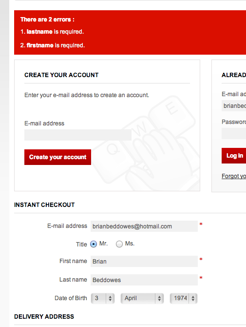 Brighteyes Posted August 14, 2013 Author Share Posted August 14, 2013 Ok, i've figured out the firstname, lastname error, or how to get round it anyway. Basically, when you autofill the guest checkout form the error occurs. You need to manually type in the first name and surname. To force the user to manually type add ....autocomplete="off" to the firstname and surname input boxes.... <input type="text" id="firstname" name="firstname" autocomplete="off" onblur="$('#customer_firstname').val($(this).val());" value="{if isset($smarty.post.firstname)}{$smarty.post.firstname}{/if}"> The code is in the authentication.tpl file. Hopefully, this will solve my checkout issue too! Link to comment Share on other sites More sharing options...