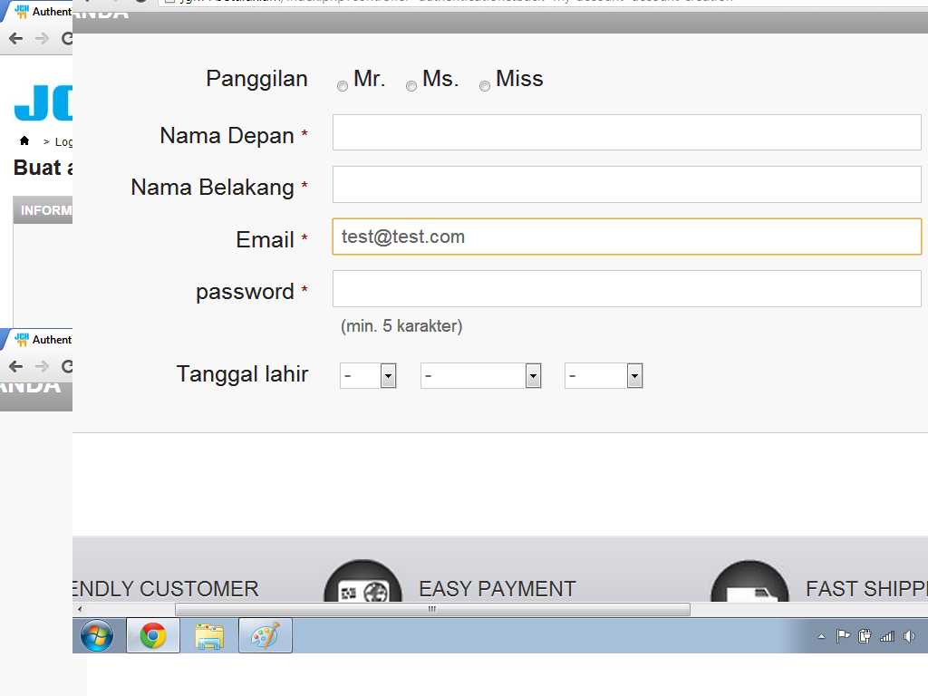 epicquest Posted March 10, 2014 Share Posted March 10, 2014 Ok I tried that and it didn't work. Default page is being used. I copied the file if someone could help it would be appreciated. This was at line 523 <!--<p class="radio required"> <span>{l s='Title'}</span> {foreach from=$genders key=k item=gender} <input type="radio" name="id_gender" id="id_gender{$gender->id}" value="{$gender->id}" {if isset($smarty.post.id_gender) && $smarty.post.id_gender == $gender->id}checked="checked"{/if} /> <label for="id_gender{$gender->id}" class="top">{$gender->name}</label> {/foreach} </p>--> <p class="required text"> <label for="customer_firstname">{l s='First name'} <sup>*</sup></label> <input onkeyup="$('#firstname').val(this.value);" type="text" class="text" id="customer_firstname" name="customer_firstname" value="{if isset($smarty.post.customer_firstname)}{$smarty.post.customer_firstname}{/if}" /> </p> <p class="required text"> <label for="customer_lastname">{l s='Last name'} <sup>*</sup></label> <input onkeyup="$('#lastname').val(this.value);" type="text" class="text" id="customer_lastname" name="customer_lastname" value="{if isset($smarty.post.customer_lastname)}{$smarty.post.customer_lastname}{/if}" /> </p> <p class="required text"> <label for="email">{l s='Email'} <sup>*</sup></label> <input type="text" class="text" id="email" name="email" value="{if isset($smarty.post.email)}{$smarty.post.email}{/if}" /> </p> <p class="required password"> <label for="passwd">{l s='Password'} <sup>*</sup></label> <input type="password" class="text" name="passwd" id="passwd" /> <span class="form_info">{l s='(Five characters minimum)'}</span> </p><!-- <p class="select"> <span>{l s='Date of Birth'}</span> <select id="days" name="days"> <option value="">-</option> {foreach from=$days item=day} <option value="{$day}" {if ($sl_day == $day)} selected="selected"{/if}>{$day} </option> {/foreach} </select> {* {l s='January'} {l s='February'} {l s='March'} {l s='April'} {l s='May'} {l s='June'} {l s='July'} {l s='August'} {l s='September'} {l s='October'} {l s='November'} {l s='December'} *} <select id="months" name="months"> <option value="">-</option> {foreach from=$months key=k item=month} <option value="{$k}" {if ($sl_month == $k)} selected="selected"{/if}>{l s=$month} </option> {/foreach} </select> <select id="years" name="years"> <option value="">-</option> {foreach from=$years item=year} <option value="{$year}" {if ($sl_year == $year)} selected="selected"{/if}>{$year} </option> {/foreach} </select> </p>--> {if $newsletter} Also at line 243 and 261, I commented out radio and birthday in both places of the file. still doesn't work, need some help please Link to comment Share on other sites More sharing options...