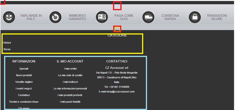 - eliminare, nel footer, la voce relativa alle categorie di prodotto; IN GIALLO