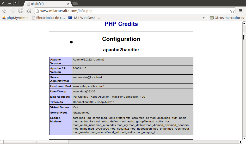 sysmac01 Posted June 18, 2013 Share Posted June 18, 2013 (edited) info.php¿El archivo lo has puesto en el directorio raiz de la página y no te muestra nada? te adjunto el archivo, debe estar en el directorio del index.php mira en la captura lo que te debe salir. Edited June 18, 2013 by sysmac01 (see edit history) Link to comment Share on other sites More sharing options...