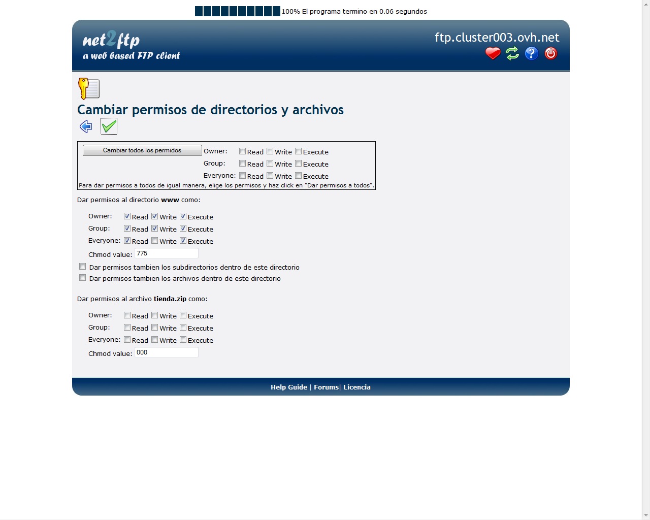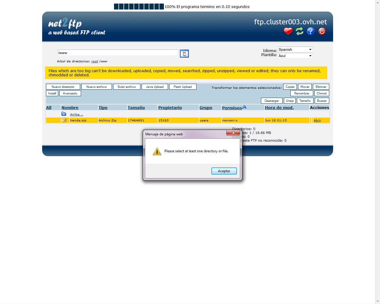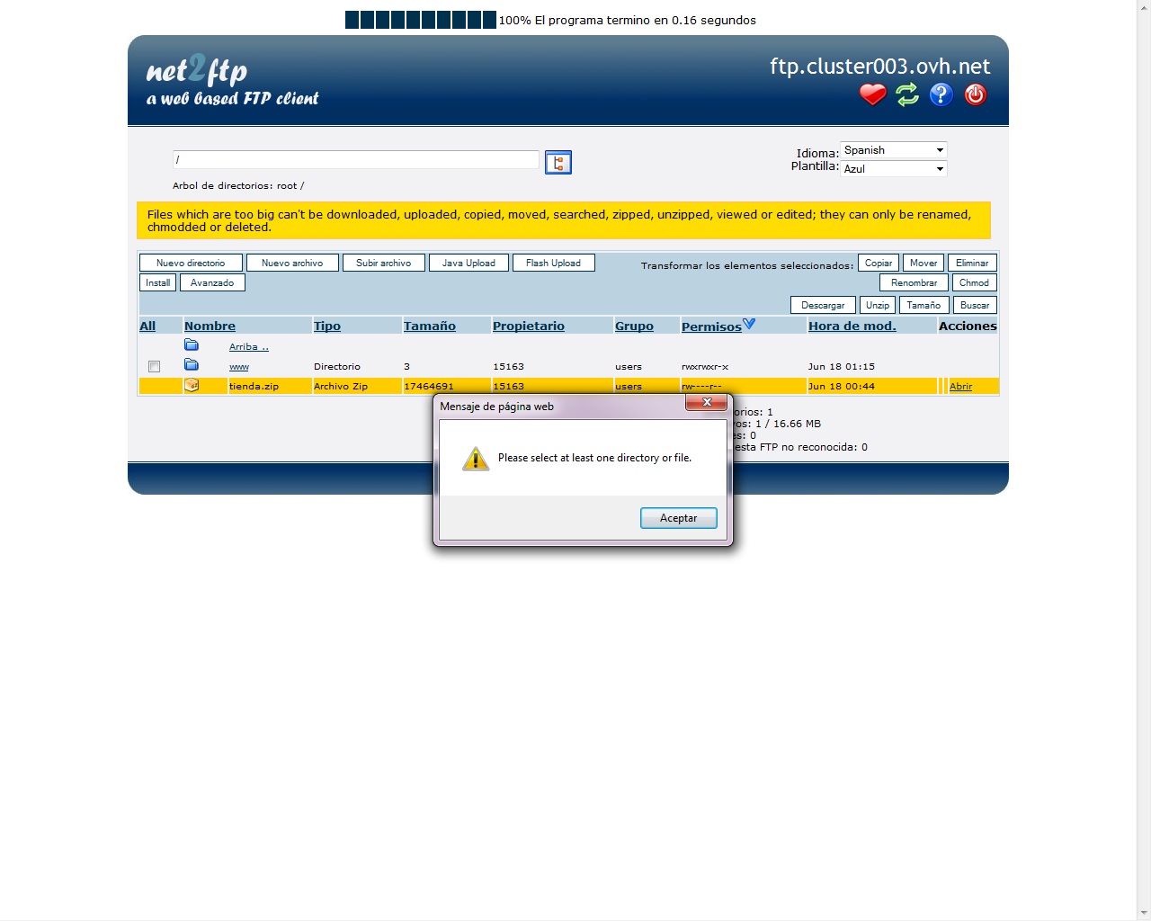 nadie Posted June 17, 2013 Share Posted June 17, 2013 Señala y pulsa donde dice arriba "chmod". Por cierto, metelo dentro del directorio "www". Y despues señala en "unzip" Link to comment Share on other sites More sharing options...
