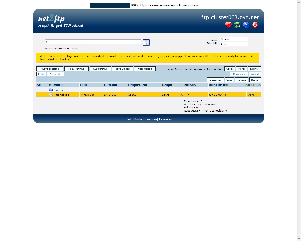 ivas Posted June 17, 2013 Author Share Posted June 17, 2013 (edited) Muy buenas: El mismo problema, la misma solución. Abre la version 1.5.4.1 que te descargues en tu ordenador y la descomprimes. Luego te metes dentro de la carpeta Prestashop y seleccionas todoas las carpetas y archivos: admin, config, modules sitemap.php, etc.... y le das a comprimir en ZIP creando una carpeta con el nombre por ejemplo "Tienda.zip" o lo que tu quieras. La cuestión es dejar fuera "Install_PrestaShop.html" . La subes comprimida por FTP o via Plesk, según si el hosting tiene habilitados los suficientes MB de carga, si no por FTP y ya esta. Después la descomprimes desde Plesk y la instalas. Se acabo el problema. OjO: No subas por FTP los archivos descomprimidos por que son muchos y se pueden corromper por el camino. Una vez lo tengas listo, instalaras la tienda sin problema. Siguiente paso. 1- Cambias la carpeta Admin por lo que tu quieras y borras la carpeta install.Ejemplo admin775 2- A través de FTP, cambias los permisos de todas las carpetas y subcarpetas a 755. 3- Entras en tu tienda a traves de la carpeta admin, con el nombre elegido. www.dominio.com/tienda/admin775 Esto sera a partir de ahora tu back office. 4- Pon en Rendimiento, Forzar compilación SIEMPRE y CACHE OFF. Te evitaras dolores de cabeza. Ya lo cambiaras cuando vallas a abrir la tienda. 5- Para cualquier otra cosa, estaremos aquí en el Foro. Indica siempre la versión Prestashop que utilizas. Un saludo Buenas, Gracias por la rapida respuesta, estoy con el primer paso, de la carpeta prestashop, todo lo vuelvo a comprimir verdad? sin dejar ningun archivo fuera?, estoy subiendolo al ftp cuando termine os comento. Gracias P:D Mira lo que me dice el ftp una vez subido. Files which are too big can't be downloaded, uploaded, copied, moved, searched, zipped, unzipped, viewed or edited; they can only be renamed, chmodded or deleted. Edited June 17, 2013 by ivas (see edit history) Link to comment Share on other sites More sharing options...