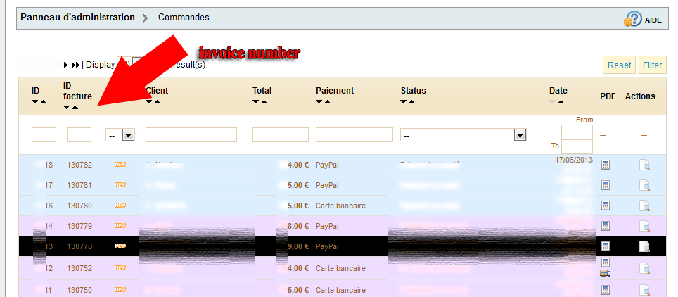 Le numéro de la facture doit s'afficher sur la page globale des commandes.