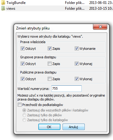 mentalspot Posted November 11, 2013 Share Posted November 11, 2013 w filezilla masz po kliknięciu prawym przyciskiem na : Prawa pliku ... tu wszystko ustalasz Link to comment Share on other sites More sharing options...