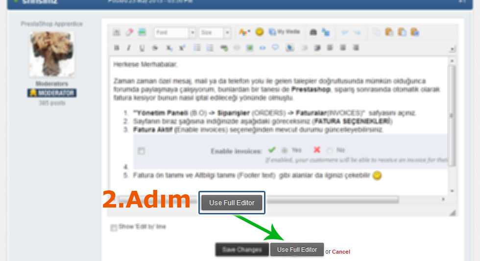 SahinSOLMAZ Posted June 7, 2016 Author Share Posted June 7, 2016 Merhaba; Ben prestashop_1.6.0.7 yi kurdum sitemdeki bizi arayın kısmını ve dükkan bilgisi alanlarını düzeltmek istiyorum. Yüklediğiniz resimler silinmiş. Ftp dosyaları üzerinden nasıl düzelte bilirim yardımcı olursanız sevinirim. Bir çok konuyu okudum denedim bir türlü başarı elde edemedim. Admin paneli üzerinden modüllerden değiştiğimde admin paneli sayfa görüntülenmiyor hatası veriyor Merhabalar, Öncelikle bu konu, forumda açılan konu başlığını nasıl düzenleyeceğinizi açıklıyor. Yaşadığınız soruna gelince, bu alanları ftp üzerinden yapmak hem uğraştırıcı hem de dinamik yapıya pek uygun bir hareket olmayacaktır. Bundan ziyade modüllerden değiştirdiğinizde "Sayfa görüntülenemiyor" hatası alıyorsanız farklı ve önemli bir sorun var demektir. Ne yapabilirim? Sistemi güncelleyebilirsiniz, 1.6.0.7 versiyonuna ait modüller klasörünü ftp 'den yeniden yükleyebilirsiniz, Hata gösterim modunu açıp, modüller sayfasından tekrar değişiklik yapabilirsiniz ve karşılacağınız hatayı burada bizimle paylaşabilirsiniz. Son olarak bu yaşadığınız problem bu konuyla ilgili olmadığı için lütfen yeni bir konu açarak devam ediniz. Başarılar. Link to comment Share on other sites More sharing options...