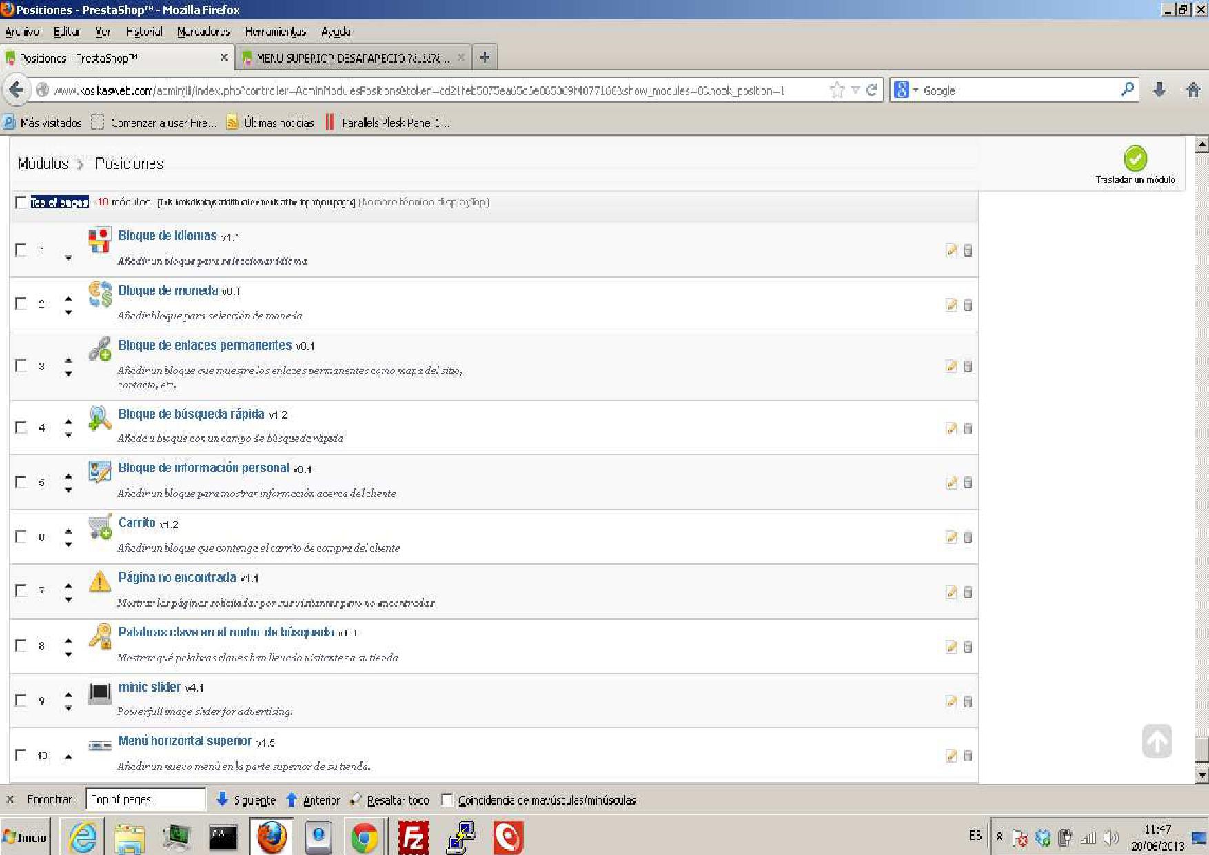 alfonso-34- Posted June 20, 2013 Author Share Posted June 20, 2013 claro que si aqui le dejo la url www.kosikasweb.com lo que me dice esta al final del menu <a name="displayTop" style="font-family: Arial, Verdana, Helvetica, sans-serif; outline: 0pt; font-size: 12px; background-color: rgb(255, 255, 255);">Top of pages - 10 módulos [This hook displays additional elements at the top of your pages] (Nombre técnico:displayTop) top of pages tiene 10 modulos y el de el de la barra esta el ultimo de todos modos te dejo una imagen gracias por tod Link to comment Share on other sites More sharing options...