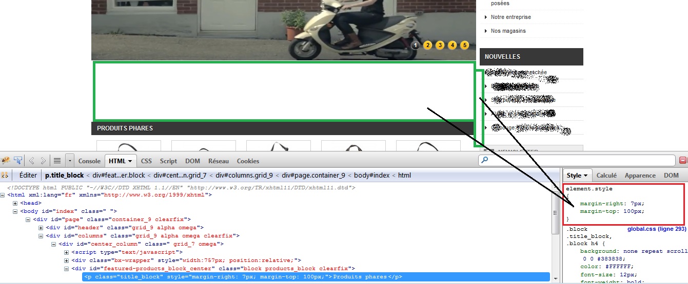 FifiLaFife Posted June 21, 2013 Share Posted June 21, 2013 Bonjour à tous, Je suis un petit nouveau sur Prestashop et un grand débutant dans le codage. Je suis en train de réaliser un site sous PrestaShop en local et j'en suis à l'étape du design. Pour réaliser mon site exactement comme je le veux, j'ai été obligé de toucher un peu au css mais là, je bloque sur plusieurs points et notamment pour ajouter des marges à des éléments bien spécifiques. Je voudrais, par exemple, ajouter une marge en haut et à gauche du bloc titre du bloc "produit phare" et je commence un peu à désespérer. J'utilise Firebug qui me classe ces modifications dans element.style (je ne sais pas à quel fichier se rapporte cette catégorie..). J'ai essayer un peu de toucher un global.css mais le problème est que tous les blocs titres changent alors que je veux uniquement le bloc titre "produit phare". Je vous mets 2 captures d'écran pour mieux vous expliquer (en rouge ce que je veux modifié et en vert c'est le rendu que j'aimerais avoir). Si vous avez besoin de plus d'information, je peux vous les donner Pouvez-vous m'expliquer comment réaliser ces modifications ? En vous remerciant d'avance et en remerciant aussi toute la communauté qui m'a aidé à de nombreuses reprises pour créer ma boutique. Link to comment Share on other sites More sharing options...