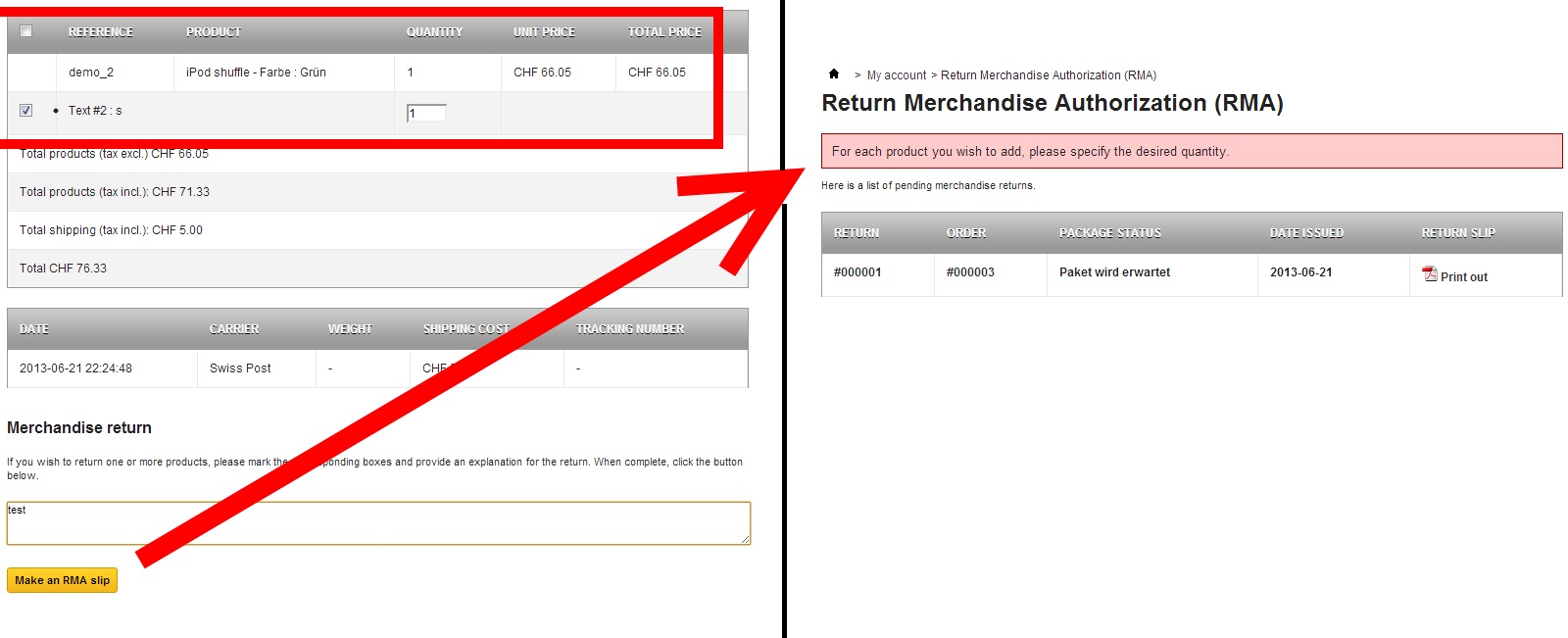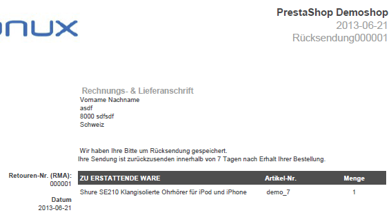 Pronux Posted June 21, 2013 Share Posted June 21, 2013 (edited) Hallo, Wenn ein Kunde einen Artikel mit Wunschtext zurücksenden will, funktioniert die Funktion unter Mein Konto > Rücksendung nicht. Aufgrund der Fehlermeldung nehme ich an, dass die Anzahl nicht übermittelt/erkannt wird: "Bitte geben Sie die gewünschte Anzahl jedes gewählten Produkts an." Anbei ein Screenshot. Wenn jemand dieses Verhalten bestätigt, dann würde ich den Bug melden. Noch eine kurze Zusatzfrage: Ist es korrekt, dass auf dem "Rücksendungs-PDF" welches der Kunde selber aufrufen kann, die Adresse des Shop (also das Ziel der Rücksendung) selber nicht aufgedruckt wird? Screenshot: Edited July 15, 2013 by Pronux (see edit history) Link to comment Share on other sites More sharing options...
