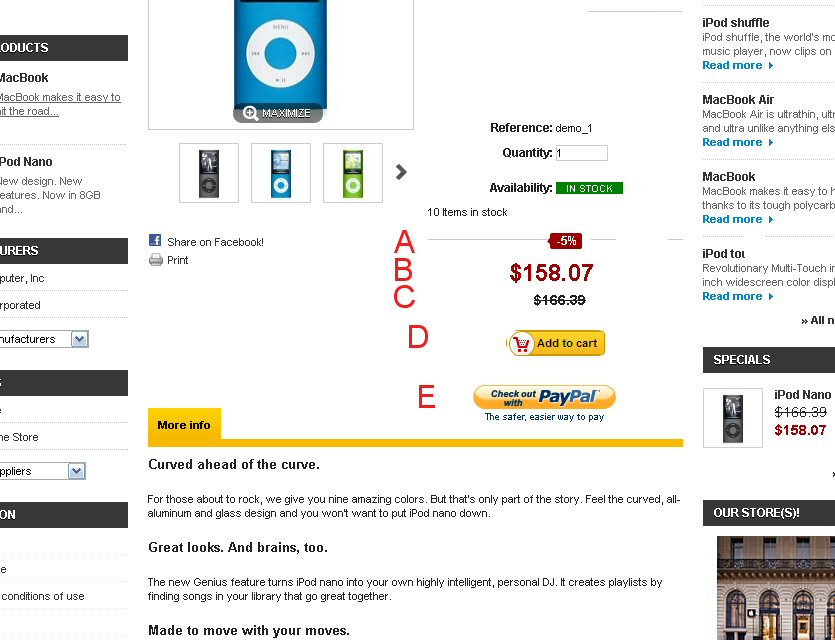 rayg Posted June 22, 2013 Share Posted June 22, 2013 (edited) Yello guys. The default Theme (product page) is meshed up I have look many hours, but i havent found it. I am using (Prestashop v1.5.4.1) default theme. I would like to change The position in a nice straight line as below (screenshot) A. Discount Label B. price C. Discount price D. Add cart E. Paypal F. How can i Change the Red price color ($158.07) to blue $158.07 G. How can i Change the Red discount Label color to blue Screenshot Edited June 22, 2013 by rayg (see edit history) Link to comment Share on other sites More sharing options...