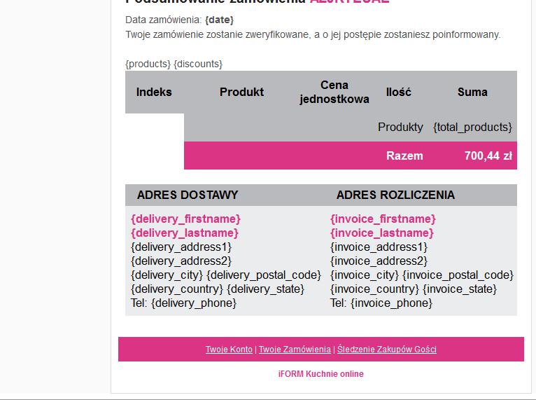 wzr1one Posted June 25, 2013 Share Posted June 25, 2013 Witam, mam pewien problem - wygląda on tak - wysyłam mail z potwierdzeniem zamówienia - niestety on niekoniecznie chcę współpracować chodzi o to, ze zamiast informacji o produktach wyświetla mi {products} i {discount} plus inne dziwne rzeczy ;< Załącznik Pytanie moje jest takie - jak to naprawić ? Link to comment Share on other sites More sharing options...