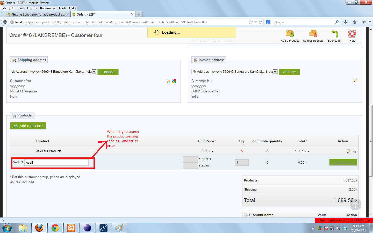 Narahari Posted June 25, 2013 Share Posted June 25, 2013 Hi Sir, I am getting the Script error for add product after generating the Order, means first generate the order and View the order, then click the add product link, then we can search the product i am getting the bellow script error and Loading... image is continously displayed and not displayed the search products, please help me... Timestamp: 25/06/2013 5:07:05 PM Error: TypeError: data.products is undefined Source File: http://localhost/pre.../admin_order.js Line: 327 Link to comment Share on other sites More sharing options...