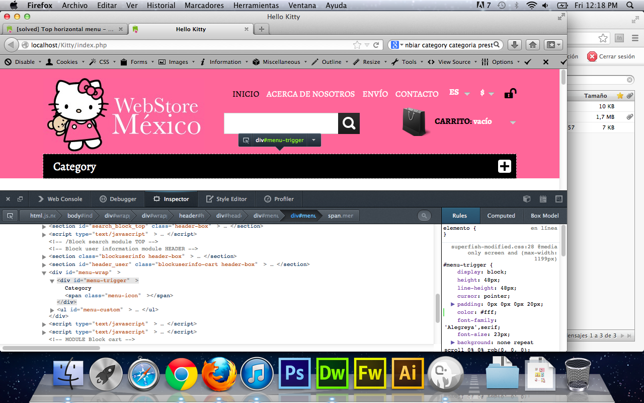 javierocanas Posted June 28, 2013 Share Posted June 28, 2013 (edited) Bien mi problema radica en que no encuentro el modulo o fichero en que se encuentra cierta configuracion del menu desplegable, la pagina esta en español pero cuando el responsive cambia a pagina movil el menu desplegable se titula catgory y quiziera cambiarlo por categorías o otro pero en español, alguna idea? utilizo el tema theme593 de template monster Edited June 29, 2013 by javierocanas (see edit history) Link to comment Share on other sites More sharing options...