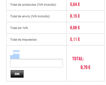 Neofita Posted June 28, 2013 Author Share Posted June 28, 2013 Ok, veo que utilizaS una de las plantillas de leo. Viendo tu tienda, tienes que ir al fichero: http://www.vibramarkt.com/tienda/themes/leodres/css/global.css Buscar esto: .cart_voucher .title_block, .cart_voucher h4 { font-size: 13px; } Y dejarlo por ejemplo así: .cart_voucher .title_block, .cart_voucher h4 { font-size: 13px; color:#797979; } me autocontesto.... llevo tantas horas mirando código que me pierdo.... me dejé las ";" Muchas gracias!! Link to comment Share on other sites More sharing options...