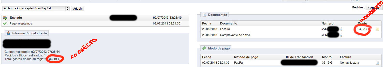 Neofita Posted July 2, 2013 Share Posted July 2, 2013 Buenas tardes, Hoy un cliente que lo tengo en un grupo de clientes con un descuento ha realizado una compra en mi tienda online. Por ahi todo correcto ya que ha podido pagar correctamente. El problema viene cuando voy a ''Pedidos'' y veo que la factura que ha generado no corresponde al precio real de la venta. El cliente ha pagado el importe correcto pero la factura no tiene todos los datos, y los que tiene no son correctos (importe). Alguien sabe cual es el problema? Ayer hice otra venta de unos productos a un cliente que no esta en ningún grupo y todo ha salido correcto. Gracias por adelantado. Link to comment Share on other sites More sharing options...