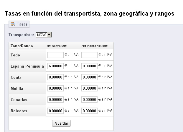 Sele Posted July 2, 2013 Share Posted July 2, 2013 Hola a todos, Tengo una duda que no se si se podrá hacer....estoy configurando las tasas de envío, y tengo varias zonas: España península, Baleares, Canarias, Ceuta y Melilla....en todas excepto España península me gustaría en lugar de poner un precio en €, me gustaría poner un texto que dijera "Consultar gastos de envío", pero en el cuadro de las tasas sólo me deja poner números, no textos...hay alguna forma de poder hacer esto? Adjunto imagen del cuadro de las tasas para que veáis que me refiero Muchas gracias Sele Link to comment Share on other sites More sharing options...