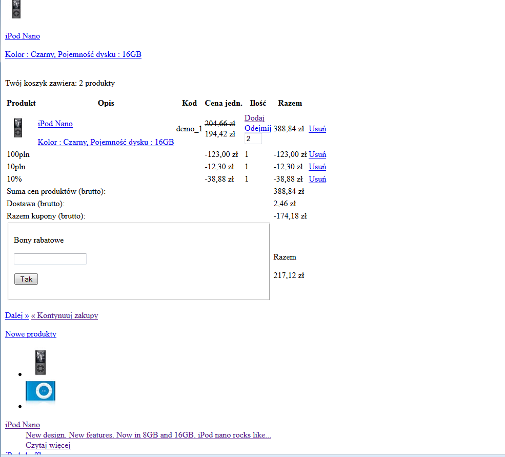 0 mentalspot Posted July 4, 2013 Author Share Posted July 4, 2013 (edited) tylko wyświetlania, w ostatnim kroku i w potwierdzeniu zamówienia jest ok cena teraz jeszcze tak patrzę, że w emailu Podsumowanie zamówienia też mi źle pokazuje. Edited July 4, 2013 by mentalspot (see edit history) Link to comment Share on other sites More sharing options...