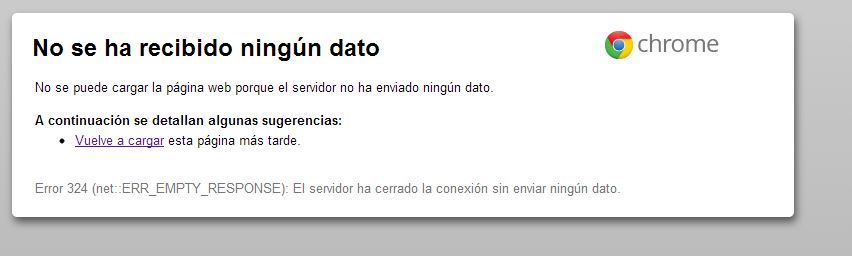 AleDeVega Posted July 5, 2013 Share Posted July 5, 2013 (edited) Hola, Desde hace unos tres días, cuando los clientes navegan por la tienda, de vez en cuando y en cualquier página, sin ningún patrón aparente, sale el siguiente error, archivo adjunto del error de chrome y firefox, aunque también sale en IE. La salida del Chrome es la siguiente: No se ha recibido ningún dato No se puede cargar la página web porque el servidor no ha enviado ningún dato. A continuación se detallan algunas sugerencias: Vuelve a cargar esta página más tarde. Error 324 (net::ERR_EMPTY_RESPONSE): El servidor ha cerrado la conexión sin enviar ningún dato. He descartado que fuera de mi ordenador ya que le sale a la mayoría de clientes que visitan la tienda. Ayer actualice la versión del Prestashop pasando de la 1.4.5.1 a la 1.4.11.0 y sigue sin solucionarse. Estoy 98% segura que es problema del Prestashop, ya que en el servidor tengo otras aplicaciones web que funcionan correctamente sin salir el error. Estoy perdidísima, ya que como digo, no sigue ningún patrón, o sale a los dos minutos de entrar a la tienda o después de estar una hora navegando, es muy raro. También me sale a mí mientras subo productos desde el Panel de Administración...me estoy volviendo loca Si alguien me puede ayudar lo agradecería enormemente Muchas gracias de antemano, Alejandra Edited July 10, 2013 by AleDeVega (see edit history) Link to comment Share on other sites More sharing options...