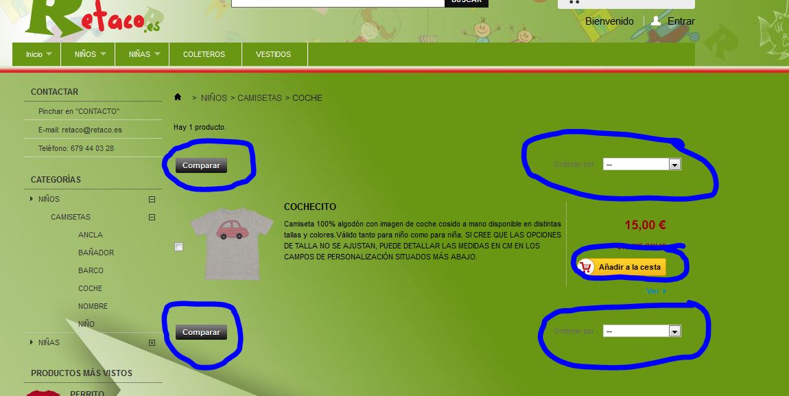 JorgeC Posted July 6, 2013 Share Posted July 6, 2013 (edited) Hola, a ver si me podéis echar una manilla... Adjunto una captura de unos botones que quiero suprimir ... El motivo es porque si pinchamos sobre las camisetas que hay en la portada podemos seleccionar color y tallas, pero si lo hacemos desde el menú desplegable superior, directamente te da la opción de añadir al carrito sin haber seleccionado talla y color a no ser que pulsemos previamente en "ver" por este motivo pretendo quitar el botón "añadir al carrito" desde la pagina que aparece con el producto si lo hacemos desde el menú superior y así obligar a pinchar en "ver" y seleccionar lo mencionado. Ya de paso, también quiero suprimir, tal como señalo en el pantallazo los botones de comparar. Necesito por favor saber dónde está el código que debo suprimir. Utilizo 1.5 Abro la web para que se pueda ver lo explicado. www.retaco.es MUCHÍSIMAS GRACIAS. Edited July 6, 2013 by JorgeC (see edit history) Link to comment Share on other sites More sharing options...
