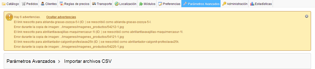 Sergio Ruiz Posted July 7, 2013 Share Posted July 7, 2013 (edited) Hola, estoy subiendo los productos a mi tienda a través de un fichero csv, las categorías ya las he importado y no me ha dado ningún fallo, si importo los productos sin las imágenes también me lo hace bien, pero cuando meto la url de las imágenes me importa bien los productos pero no me incluye las imágenes. Estoy trabajando con prestashop 1.5.4.1, ahora mismo estoy en realizando la tienda en local, ya que quiero ver que funciona todo bien y luego ya subirla al servidor. ¿Hay que modificar permisos de carpeta o algo para que te deje hacerlo? ../../imagenes/imagenes_productos así es como pongo la ruta de las imágenes Hola.... Si tu las imagenes la has subido al directorio "cachita" en el raiz. La ruta seria: ../cachita/nombre_imagen.jpg Otra cosa... ¿Tienes aplicado este parche: https://github.com/P...8b3674e2bc0b546 ? Edited July 7, 2013 by Rubalcaba (see edit history) 1 Link to comment Share on other sites More sharing options...