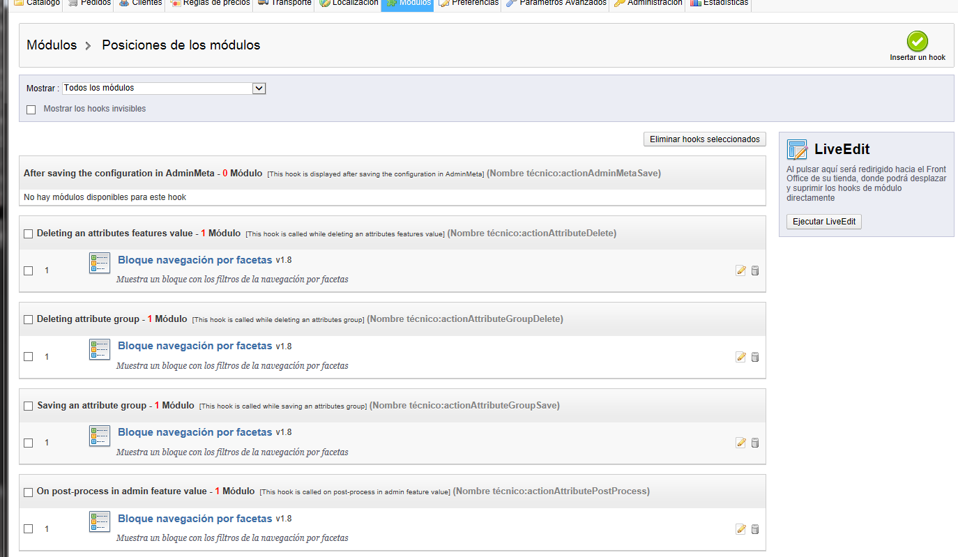 smokinGTeam Posted July 7, 2013 Author Share Posted July 7, 2013 Pestaña Modulos -> Posiciones -> (Ver un boton verde llamado "Trasladar Modulo") (Pulsa sobre ese boton) Al seguir tus indicaciones no he encontrado ese botón que me comentas pero he encontrado otro mucho mejor, LiveEdit: solo seleccionas los modulos y los arrastras a la nueva posicion. Parece ser que en esta nueva version sustituyen este boton por el nuevo sistema LiveEdit. Tema solucionado, Muchas gracias !!!! Link to comment Share on other sites More sharing options...