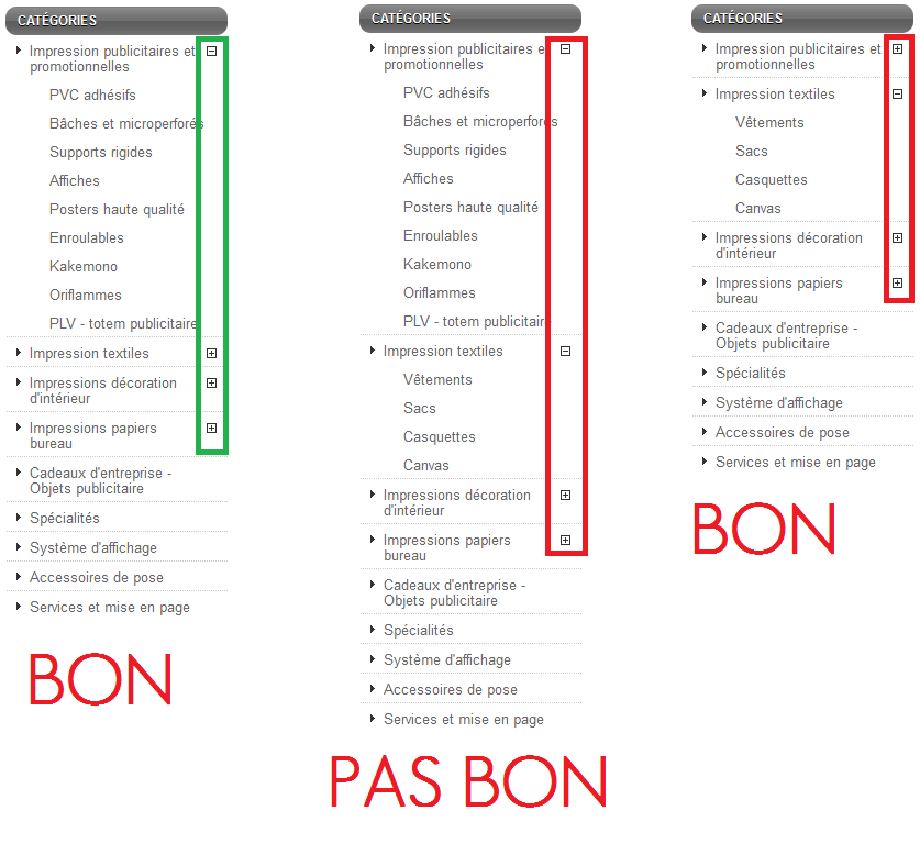 stevent Posted July 8, 2013 Share Posted July 8, 2013 Bonjour à tous, Je bloque sur un problème dans la configuration du menu vertical du site suivant : http://tempo.printingandco.com Lorsque nous avons une SOUS Catégorie, un petit " + " s'affiche à droite de la catégorie. Lorsqu'on clique sur ce petit "+", le tout se déroule. Jusqu'ici tout va bien. Ma demande : Lors que je cloque sur un AUTRE petit "+" d'un AUTRE catégorie, les deux catégories restent déroulées. Ce qui, je pense, est normal vu que c'est configuré comme ce là. Mon problème : Je voudrais que, lorsque je clique sur un AUTRE petit "+", le premier se ferme afin de ne pas avoir une page trop long en haut. J'ai join un fichier image qui illustrera ma demande. Je ne sais pas du tout à quelle partie de code je peux m'attaquer pour cela. Quelqu'un peut il m'aider? Merci d'avance ! Steven D'Heygere Link to comment Share on other sites More sharing options...