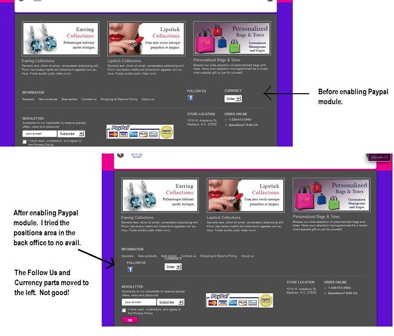 wellnix Posted July 8, 2013 Share Posted July 8, 2013 I'm using the Ultimateshop Pro 2 theme with the latest version of Prestashop. Everything looks great until I enable the Paypal module. Then the links in the footer are out of whack. It stayed messed up even after deleting the module position. See images before and after. Any ideas? Thanks...... Link to comment Share on other sites More sharing options...