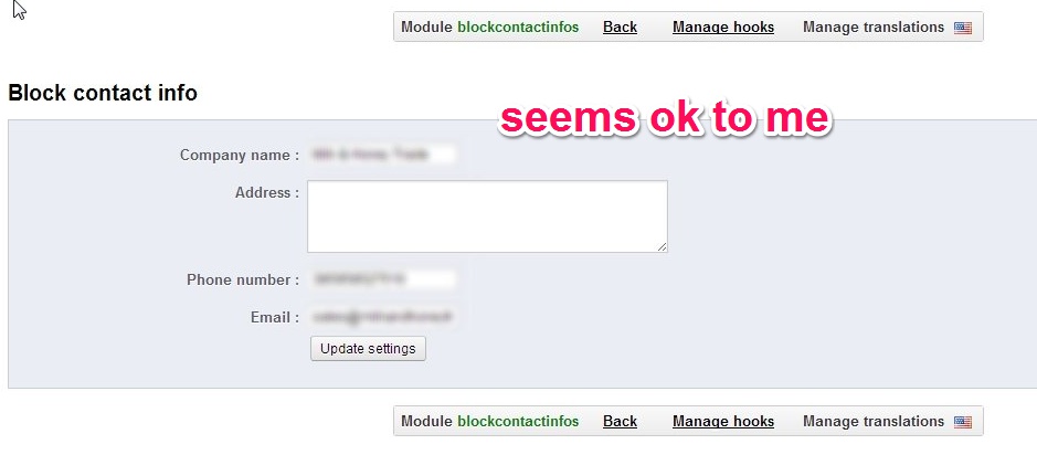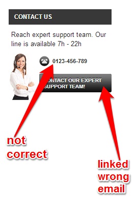 footer is set properly but right contact block wont change despite whichever blockcontact.tpl is changed (me hovever suceded managed changeing 24/7 to 7h-22h by myself while i can not change telphone number beside support lady photo and telephone icon wright in "right blockcontact" as you can see on screenshoots provided, also email link doesn`t like to link properly for same address in footer. Sorry for my English sometimes it is not clear, horrible. Shame on me. How i can change that problem?