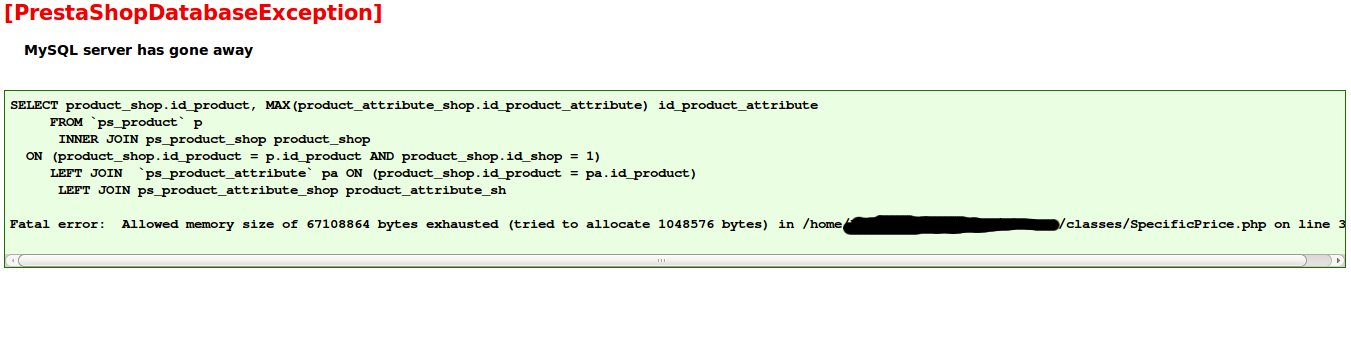 Fatal error: Allowed memory size of 67108864 bytes exhausted (tried to allocate 1048576 bytes) in /home/site/classes/SpecificPrice.php on line 367