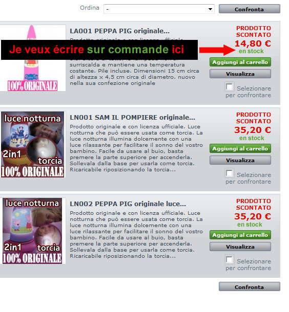 gaiasl Posted July 24, 2013 Share Posted July 24, 2013 Dans la fiche produit onglet quantité dans le champs "Message quand hors-stock mais pouvant être commandée chez le fournisseur :" Je l'ai fait et la fiche produit est très bien. Le problème, c'est la liste des produits. S'il vous plaît regardez vois le file lista prodotti.jpg je vous remercie!! Link to comment Share on other sites More sharing options...
