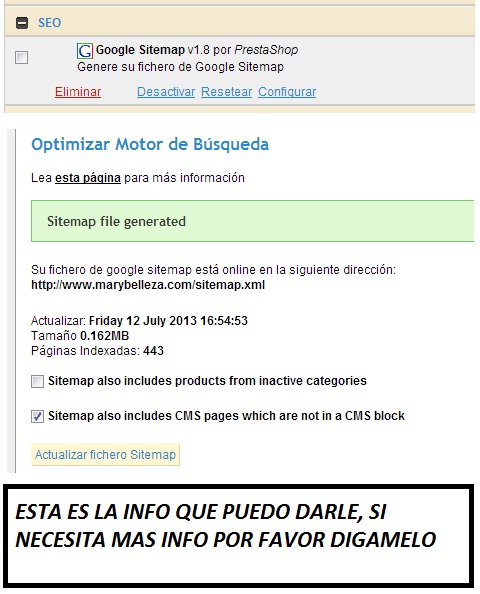 mc668824 Posted July 12, 2013 Author Share Posted July 12, 2013 he visto su enlace https://github.com/P...master/gsitemap pero no se que hacer con el ni donde insertar el código que da el gsitemap.xml en mi prestashop. Gracias de nuevo por atender mi petición. Link to comment Share on other sites More sharing options...