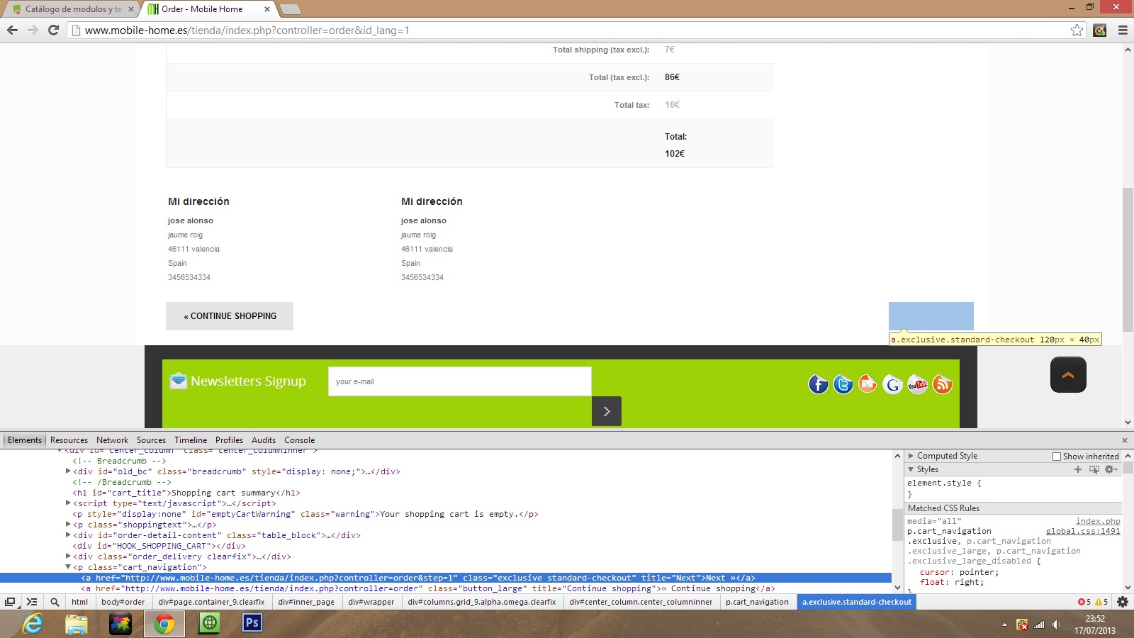 mobile home Posted July 17, 2013 Share Posted July 17, 2013 Hola, tengo un problema con el proceso de compra del pedido. No aparece el botón "siguiente" y el cliente no podría continuar hasta el pago. Uso el tema Electronics HTML5 Responsive v1.5.4 Theme y la version de prestashop es la 1.5.4.1 Adjunto una captura de la pantalla para que lo veáis Muchas gracias. Link to comment Share on other sites More sharing options...