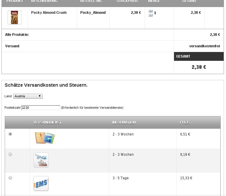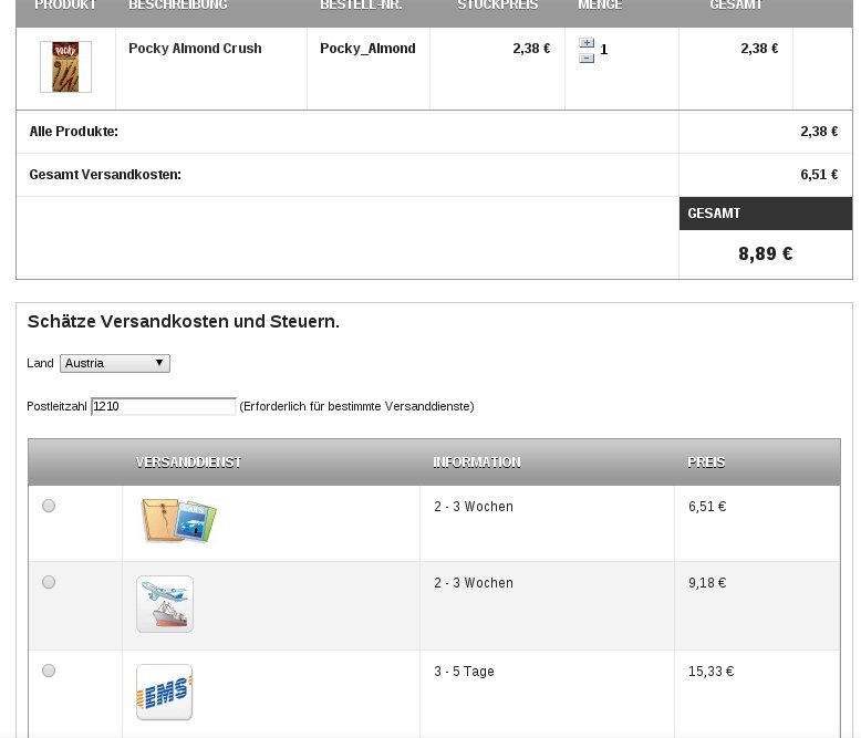 Grauer Posted July 20, 2013 Author Share Posted July 20, 2013 Habe nun eine Lösung für mein Problem gefunden. Ich vermute zwar das die Lösung an sich nicht ganz Richtig ist aber sie führt zu meinem gewünschten Ergebnis und es stellen sich auch soweit ich sehen kann für mich keine Nachteile heraus. Ich habe nun unter Versand - Versanddienste - Bearbeiten die Versanddienste für alle Zonen (Afrika, Asien, ....) aktiviert und nun zeigt der Warenkorb mein gewünschtes Ergebnis. Die Einschränkung der Länder die ich beliefere habe ich einfach unter Lokalisieren - Länder eingerichtet indem ich dort die Auswahl beschränke. Link to comment Share on other sites More sharing options...