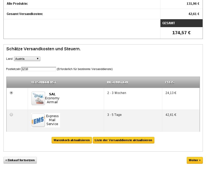 Grauer Posted July 20, 2013 Author Share Posted July 20, 2013 Hallo Luca01, Hab dort "Bester Preis" eingetragen. Mir ist aber grad noch was zum Thema Versand aufgefallen. Ich berechne alle Versandkosten nach Gewicht, habe aber jetzt für Kleinstbestellungen auch einen "Briefversand" kreiert welchen ich aber auf einen Warenwert von z.B. max. 10 Euro limitieren möchte da dieser Versand nicht versichert ist. Ich kann jetzt zwar beim Versanddienst angeben dass das max. Paketgewicht bei diesem Versand 0,5kg ist und unter der Preisspanne dann von 0 bis 10 Euro. Wenn nun ein Kunde was in den Warenkorb legt was unter 0,5kg hat und der Wert kleiner als 10 Euro ist ist alles klar. Wenn der Kunde was im Warenkorb hat was über 10 Euro kostet wird der Briefversand nicht angezeigt. Richtig so. Wenn der Kunde aber was in den Warenkorb legt was unter 10 Euro kostet aber schwerer als 0,5kg ist dann wird der Briefversand angezeigt. Er kann den Briefversand zwar nicht auswählen, aber er wird trotzdem als Auswahlmöglichkeit ohne Hinweis im Warenkorb angezeigt. Link to comment Share on other sites More sharing options...