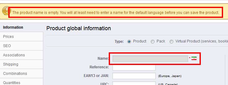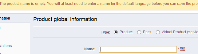 when i want to add new product i see this warning message that The product name is empty. You will at least need to enter a name for the default language before you can save the product.