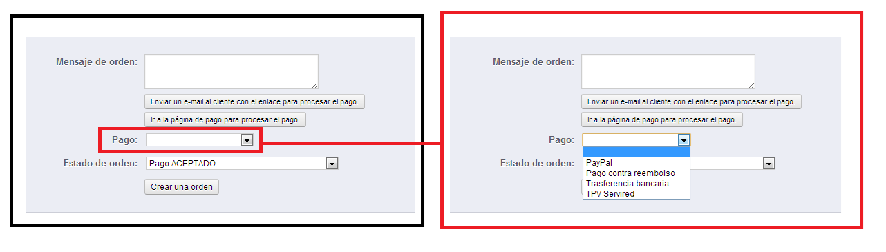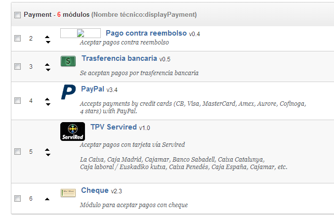 marcial Posted July 20, 2013 Share Posted July 20, 2013 Pues eso, que he reinstalado algun modulo de pago y ahora me dice que tengo 6 modos de pago en vez de los 5 que tienen que estar, y lo malo es que uno de los modos de pago aparece en blanco como podreis ver en las imagenes que anexo. No los muestra al cliente de la tienda, pero es una tienda en la que hacemos muchos pedidos manuales y necesito que el orden de los modos de pago este correcto, algo que no me respeta. Habia puesto contrareembolso primero, pero sale el modo este vacio y me tiene desesperao. a ver si a alguien se le ocurre una solucion Saludos y Gracias Link to comment Share on other sites More sharing options...