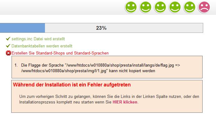 Cadooh Posted July 20, 2013 Share Posted July 20, 2013 Hallo zusammen, ich bin auf der Suche nach einem Shopsystem auf Presta gestossen und habe die Software ordnungsgemäß auf meinem Server geladen. Bei der der Installation bricht das Programm regelmäßig bei 23% ab Ich habe den Screenshot beigefügt. Was habe ich da falsch gemacht ?? LG Cadooh Link to comment Share on other sites More sharing options...