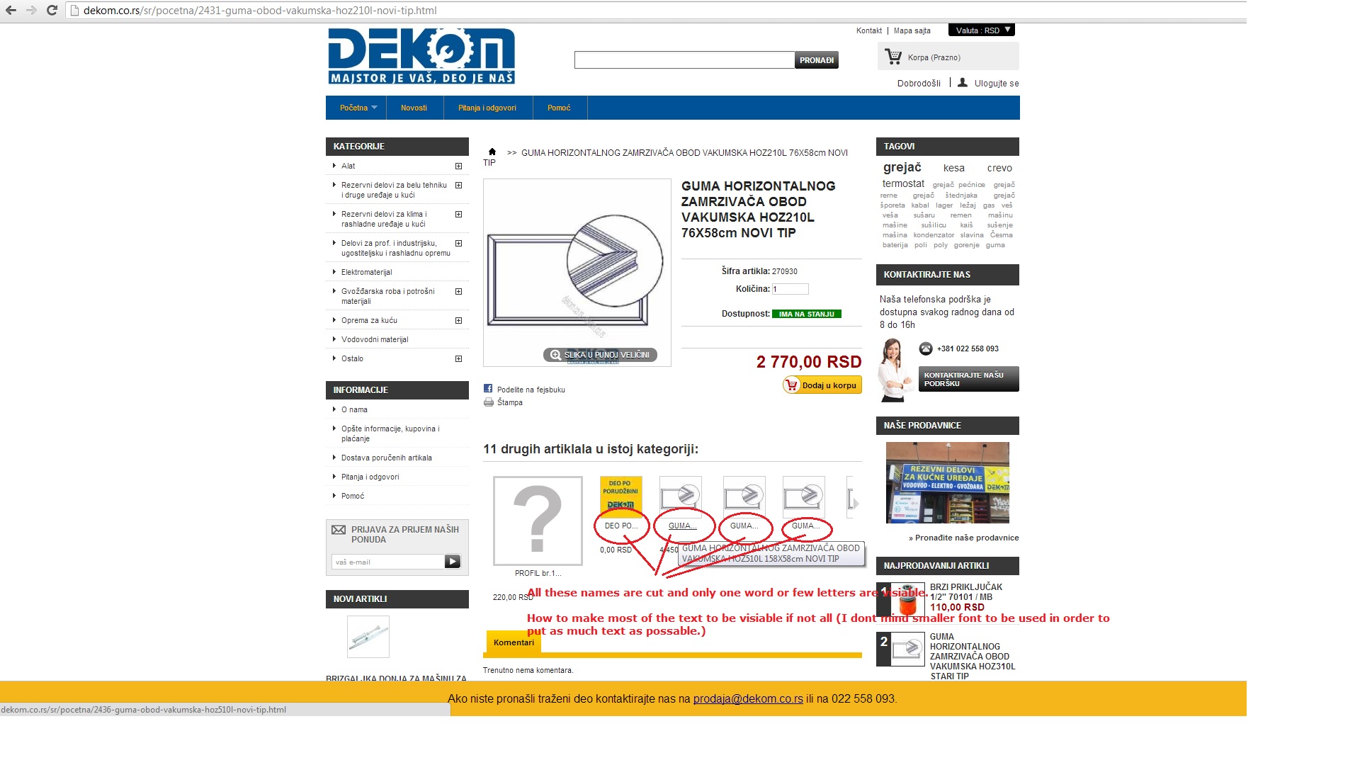 Dolke Posted July 24, 2013 Author Share Posted July 24, 2013 Hm, Im not sure how to do that Which CSS file do I need to edit exactly? Also, you can see that product that has no image is displayed differently then all others. Check this page for example. http://dekom.co.rs/sr/pocetna/2427-guma-gorenje-vakumska-zs310l-109x63-362202-gorenje.html Vekia, can you help me with these simple CSS tasks? I would like to pay you for these small customisations. Also, did you take a look at stores page? Link to comment Share on other sites More sharing options...