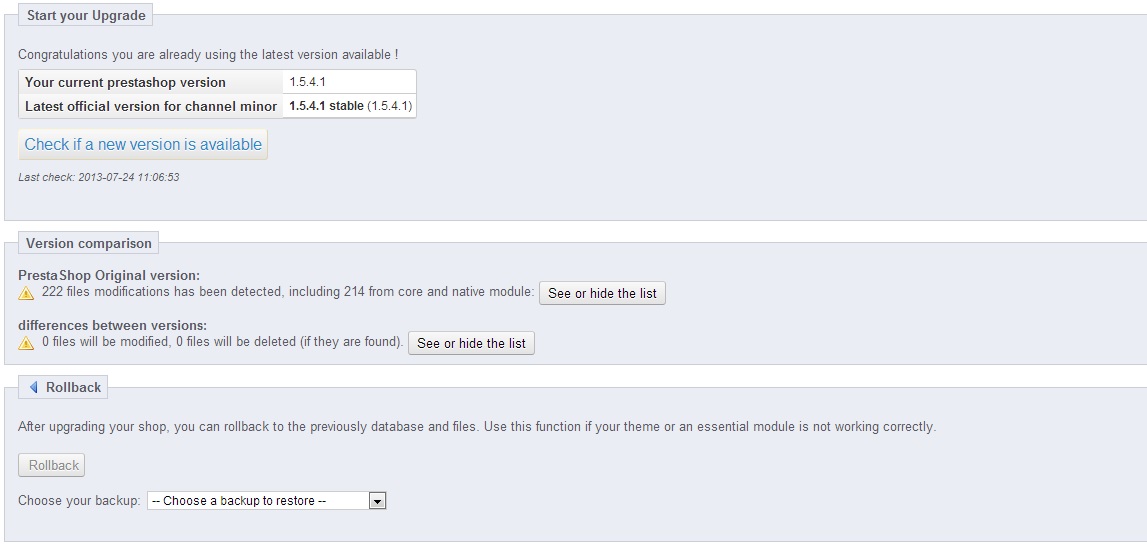 El Patron Posted July 24, 2013 Share Posted July 24, 2013 If I may ask, and forgive my ignorance, what is the meaning of vanilla here? sorry...vanilla means a fresh download of your current version of PrestaShop, un-modified. you can find all the versions here... http://code.google.com/p/prestashop/downloads/list my advice, drop modifications that you just can do without...only keep the ones you really have to have. When you move the code to the new release, mark it with a tag you can easily search for later. The less modification you make the easier it will be to upgrade...I'm hearing rumors that 1.6 is going to rock... and remember...back up back up back up... Link to comment Share on other sites More sharing options...