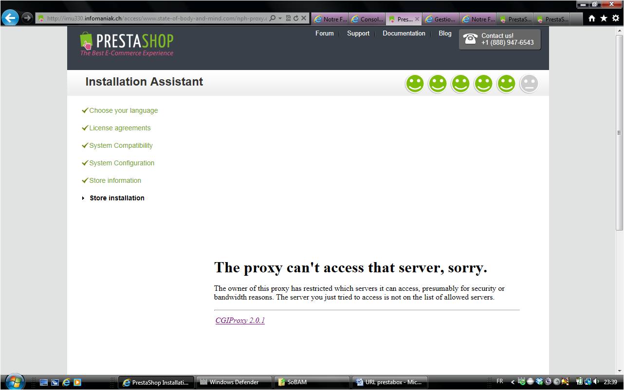 SoBAM Posted July 25, 2013 Share Posted July 25, 2013 Bonjour à tous, Je suis en train d'installer ma boutique Pshp 1.5.4.1 ( ). La dernière étape "Store installation" est bloquée, elle ne se déclenche pas ( ). Voici le message (voir la copie d'écran attachée pour plus d'info): "The proxy can't access that server, sorry. The owner of this proxy has restricted which servers it can access, presumably for security or bandwidth reasons. The server you just tried to access is not on the list of allowed servers. CGIProxy 2.0.1 " Qu'est-ce que je n'ai pas bien fait? Que puis je faire pour savoir pourquoi toutes les connexions à partir de cette page de l'assistant d'installation vers Prestashop sont bloquées? (je ne peux pas arriver à ce forum à partir du lien de la page, même message d'erreur, alors que avec une autre onglet du même navigateur et séance je peux bien arriver comme témoigne ce post) Quelle solution je peux intaller? Pour info: hébergeur Infomaniak J'ai une boutique prestabox encore active (au point d'être fermée) avec le même nom de domaine Merci d'avance pour votre aide Link to comment Share on other sites More sharing options...