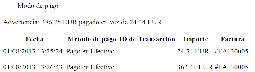 speedy13 Posted August 1, 2013 Share Posted August 1, 2013 (edited) Buenas tardes, Ante todo gracias por las soluciones que hay en el foro. Tengo un problema que he estado buscando en el foro, he encontrado algun tema parecido pero la solución que se decia en el no es la solución a mi problema. El caso es, al hacer un pedido y darlo como pago aceptado me sale "Advertencia: 386,75 EUR pagado en vez de 24,34 EUR". La cantidad a pagar i pagada es de 24,34€, pero sale este mensaje. He visto en algún otro post que podria ser por el tema de stock, que fuera 0 o negativo. No es mi caso. Me sale lo siguiente: Buenas tardes, Ante todo gracias por las soluciones que hay en el foro. Tengo un problema que he estado buscando en el foro, he encontrado algun tema parecido pero la solución que se decia en el no es la solución a mi problema. El caso es, al hacer un pedido y darlo como pago aceptado me sale "Advertencia: 386,75 EUR pagado en vez de 24,34 EUR". La cantidad a pagar i pagada es de 24,34€, pero sale este mensaje. He visto en algún otro post que podria ser por el tema de stock, que fuera 0 o negativo. No es mi caso. Me sale lo siguiente: Espero me ayudeis, Muchas gracias. Edited August 6, 2013 by speedy13 (see edit history) Link to comment Share on other sites More sharing options...