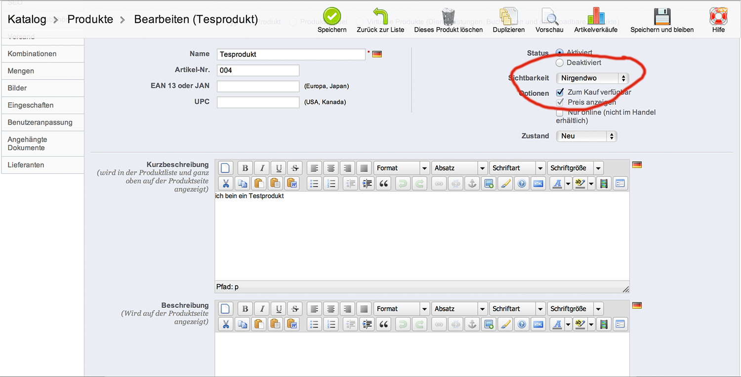 Devil089 Posted August 2, 2013 Author Share Posted August 2, 2013 Hi cd2500, vielen Dank für deine schnelle Anwort. Ich glaube es ist immer noch etwas unklar was ich meine. Ich möchte ein produkt im Backoffice anlegen, das aber nicht im Frontoffice angezeigt wird. ( Es soll aktiviert sein) Es soll schon über eine Lagermenge verfügen und gekauft werden können. Es soll lediglich nicht im Frontend zu sehen sein. Sondern nur den Kunden zugänglich gemacht werden , denen ich den passenden Link zu dem Produkt schicke. Deshalb verstehe ich nicht wozu die Funktion oben im meinem Screenshot da ist. Sichbarkeit: nirgendwo Sollte ja bedeuten das das Produkt aktiviert ist aber im Frontend unsichtbar ist. Und derjendige der den richtigen Produktlink kennt es trotzdem kaufen kann. So verstehe ich das jedenfalls Aber da tut sich leider garnichts. Ich frage mich wozu das gut sein soll. Grüße Devil Link to comment Share on other sites More sharing options...