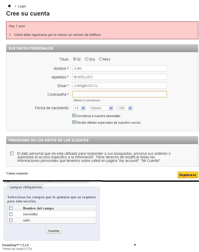 nadie Posted August 5, 2013 Share Posted August 5, 2013 Hola amigos , Cuando un cliente desea registrase en mi sitio , marca el siguiente error Hay 1 error Usted debe registrarse por lo menos un número de teléfono El tema es que en la pagian de registro no tengo la opcion de poner en ninguna parte el numero de telefono.. Fui a la opcion Clientes , Establecer Campos Obligatorios y no hay nada marcado...(Ver Imagen) Espero me puedan ayudar , con este tema que me tiene de cabeza Juan Vamos a ver..... Te aparece el registro simplificado, porque en la pestaña Preferencias -> Clientes tienes señalado donde dice: Tipo de proceso de registración la opción: Sólo creación de cuenta Si activas la opción que dice: Estándar (creación de cuenta y creación de dirección) te aparecera el formulario de registro completo, incluido la dirección para registrar, en la que va el telefono. --- Si quieres que el telefono, no sea obligatorio, puedes ir a la pestaña Preferencias -> Clientes y donde dice: Número telefónico señala No (Graficamente lo tienes explicado aquí: http://victor-rodenas.com/2012/11/14/guia-establecer-numero-de-telefono-como-opcional-en-el-registro-de-usuario-en-prestashop-1-5/ ) Si lo quieres obligatorio (que por defecto te obliga a introducir el movil o le fijo (uno de los dos), pero quieres definir cual de los dos es obligatorio (el movil o el fijo) en la pestaña Clientes -> Direcciones, tienes una sección que dice: (Aquí `tambien puedes definir que ambos sean obligatorios) Establezca los campos obligatorios para esta sección donde te saldra phone_mobile y phone entre otros campos relativos a la dirección del cliente. Link to comment Share on other sites More sharing options...