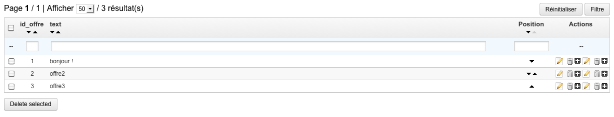 paradeyes Posted August 6, 2013 Author Share Posted August 6, 2013 Merci beaucoup pour votre réponse rapide. Si j'ai bien compris, j'ai donc rajouté cette ligne à la fonction initList() , mais ce qui n'a malheureusement rien changé. (Je vous mets la fonction pour être sûr que je l'ai bien placé au bon endroit : protected function initList() { $this->fields_list = array( 'id_offre' => array( 'title' => $this->l('Id_offre'), 'width' => 30, 'type' => 'text', ), 'text' => array( 'title' => $this->l('Text'), 'width' => 200, 'type' => 'text', 'filter_key' => 'a!lastname' ), 'lienURL' => array( 'title' => $this->l('Lien'), 'width' => 50, 'type' => 'text', ), 'active' => array( 'title' => $this->l('Status'), 'width' => 50, 'active' => 'status', ), 'position' => array( 'title' => $this->l('position'), 'width' => 30, 'position' => 'position', ), ); $this->_defaultOrderBy = 'position'; if (Shop::isFeatureActive()) $this->fields_list['id_shop'] = array('title' => $this->l('ID Shop'), 'align' => 'center', 'width' => 25, 'type' => 'int'); $helper = new HelperList(); $helper->shopLinkType = ''; $helper->simple_header = true; $helper->identifier = 'id_offre'; $helper->actions = array('edit', 'delete'); $helper->show_toolbar = true; $helper->imageType = 'jpg'; $helper->toolbar_btn['new'] = array( 'href' => AdminController::$currentIndex.'&configure='.$this->name.'&add'.$this->name.'&token='.Tools::getAdminTokenLite('AdminModules'), 'desc' => $this->l('Add new') ); $helper->title = $this->displayName; $helper->table = $this->name; $helper->token = Tools::getAdminTokenLite('AdminModules'); $helper->currentIndex = AdminController::$currentIndex.'&configure='.$this->name; return $helper; } Link to comment Share on other sites More sharing options...