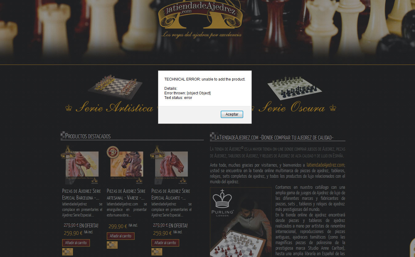 latiendadeajedrez Posted August 8, 2013 Share Posted August 8, 2013 (edited) Quería comentaros algo que me está pasando en la tienda y que no doy con la solución, he rebuscado y realizado todo lo habido y por haber respecto al problema del Technical Error pero de momento sigo estancado, debo de tener problemas con la ejecución de scripts pero tampoco estoy seguro ni sé como solucionarlo. El problema es el mensaje saliente (TECHNICAL ERROR: unable to load form. Details: Error thrown: [object Object] ) cuando añado, exclusivamente en FIREFOX (en los otros navegadores funciona perfecto), productos al carrito, o intento crear una cuenta de cliente nuevo, entrada en el admin, cada vez que se intenta ejecutar un botón. Incluso cuando hago login en la web me salta a: La conexión ha sido reiniciada. La conexión al servidor fue reiniciada mientras la página se cargaba. Esto solo me pasa en firefox, a ver si me podeis ayudar. Gracias. la web es: www.latiendadeajedrez.com Versión de prestashop 1.5.4.1 Edited August 8, 2013 by latiendadeajedrez (see edit history) Link to comment Share on other sites More sharing options...