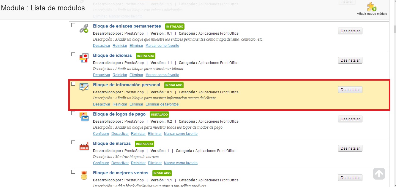 nadie Posted August 9, 2013 Share Posted August 9, 2013 Me meti al Demo de prestashop del BO y encontre cual fue el modulo que por error elimine, alguien sabe de donde puedo descargarlo?? O alguien sabe como se llama la carpeta?? Adjunto una imagen. Gracias y espero me puedan ayudar. Ali La carpeta del modulo "bloque de información personal" se llama: blockuserinfo Si lo has borrado físicamente, puedes volver a bajarte Prestashop y copiar la carpeta "/modules/blockuserinfo/". Si lo has desinstalado, simplemente vuelve a instalarlo desde la pestaña modulos -> modulos. Link to comment Share on other sites More sharing options...
