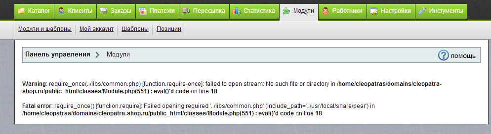 markbonk Posted August 9, 2013 Share Posted August 9, 2013 Помогите пожалуйста. Есть сайт http://cleopatra-shop.ru При установке очередного модуля в админке появилась надпись: Warning: require_once(../libs/common.php) [function.require-once]: failed to open stream: No such file or directory in /home/cleopatras/domains/cleopatra-shop.ru/public_html/classes/Module.php(551) : eval()'d code on line 18 Fatal error: require_once() [function.require]: Failed opening required '../libs/common.php' (include_path='.:/usr/local/share/pear') in/home/cleopatras/domains/cleopatra-shop.ru/public_html/classes/Module.php(551) : eval()'d code on line 18 Невозможно посмотреть и настроить ни один модуль. Как убрать эту надпись и вернуть доступ к модулям? Скрин во вложении Link to comment Share on other sites More sharing options...
