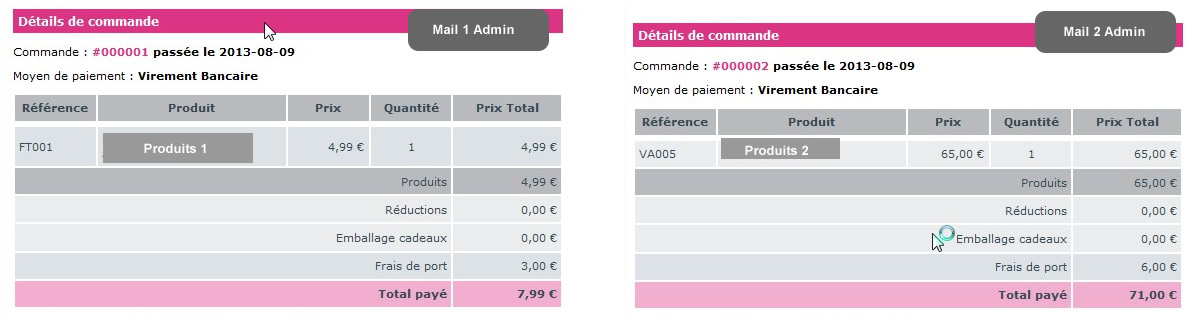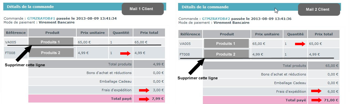 Recalls74240 Posted August 9, 2013 Share Posted August 9, 2013 Bonjour, Je vous explique mon problème, sur ma boutique qui utilise Prestashop 1.5.4.1 j'ai deux transporteurs qui s'appliquent chacun un une catégorie spécifique de produits. 1 transporteur par lettre pour produit A en fonction du prix 1 transporteur par colis pour produit B en fonction du poids Jusque là tout va bien, 1 ) si le client commande seulement un produit A, seulement le transporteur par lettre lui est proposé. 2 ) si le client commande seulement un produit B, seulement le transporteur par colis lui est proposé. 3) si le client commande un produit A et B, le transporteur par lettre et par colis lui seront proposé et seront additionné pour donner un total de frais de port. Si le client passe une commande avec dans son panier la formule 3), une fois le paiement validé, deux mails de confirmation sont envoyé au client car cela créé une commande liée avec la même référence mais avec un #1 pour la commande du produit qui va être livré le transporteur par lettre et la même référence suivie de #2 avec la commande du produit qui va être livré le transporteur par colis. Le problème, dans les deux mails envoyé au client (voir image MailClient.jpg) , les deux produits sont listé dans les deux mail avec un frais de port et un total à payer correspondant à un seul produit alors que dans les deux mails envoyé via le module alerte mail (voir image MailAdmin.jpg) tout est ok, ils affichent un seul produit avec le bon frais de port et le bon total à payer En regardant les smarty utilisés, le mail côté client utilise {products} et le mail admin utilise {items} Ma question est quel smarty il faut utilisé dans le mail de confirmation client pour afficher que le produit concerné ou quelle class modifier dans prestashop pour réglé ce problème qui peut porter à confusion le client surtout si il a choisi de payer par virement bancaire. Merci d'avance pour celui ou celle qui peut m'apporter un début de réponse sur le sujet Bonne journée Link to comment Share on other sites More sharing options...