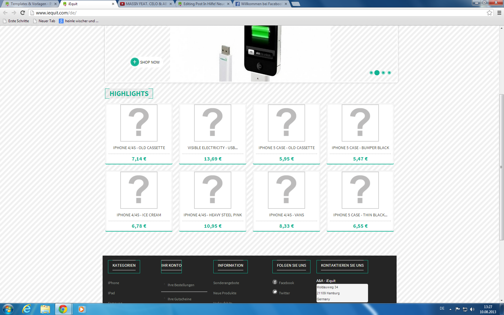saiufi Posted August 10, 2013 Author Share Posted August 10, 2013 Ok, dann Plan B. Ich hab gesehen, dass du wieder das Default-Template aktiviert hast. Da sind die Bilder ja zu sehen. Also sind sie für PrestaShop vorhanden und brauchen auch nicht mehr regenieriert werden. Mein Vorschlag diesbezüglich hat sich also erledigt. Dann vermute ich mal, dass dein neues Template auf falsche Bildpfade verlinken will. Wenn du, was ich jetzt hoffe, Firefox verwendest, dann solltest du dir jetzt da kostenlose Addon Firebug installieren. Wenn das geschehen ist, mach bitte Folgendes: Aktiviere erneut das neue Template Ruf deinen Shop auf Klick mal auf das erste Bild in Highlights mit der rechten Maustaste und wähl die Option 'Element mit Firebug untersuchen'. Dann öffnet sich unten ein Fenster und da sollte jetzt folgender Code hervorgehoben sein: <a class="product_image" title="IPhone 4/4s - Old Cassette Black" href="http://www.DeineWebsite.com/de/home/28-iphone-44s-old-cassette-black.html"> <img width="124" height="124" alt="IPhone 4/4s - Old Cassette Black" src="http://www.DeineWebsite.com/86-home_default/iphone-44s-old-cassette-black.jpg"> </a> Steht da wirklich DeineWebsite.com/86-home_default/iphone-44s-old-cassette-black.jpg? (Natürlich nicht das Wort DeineWebsite! ) ich benutze leider chrome :S Link to comment Share on other sites More sharing options...